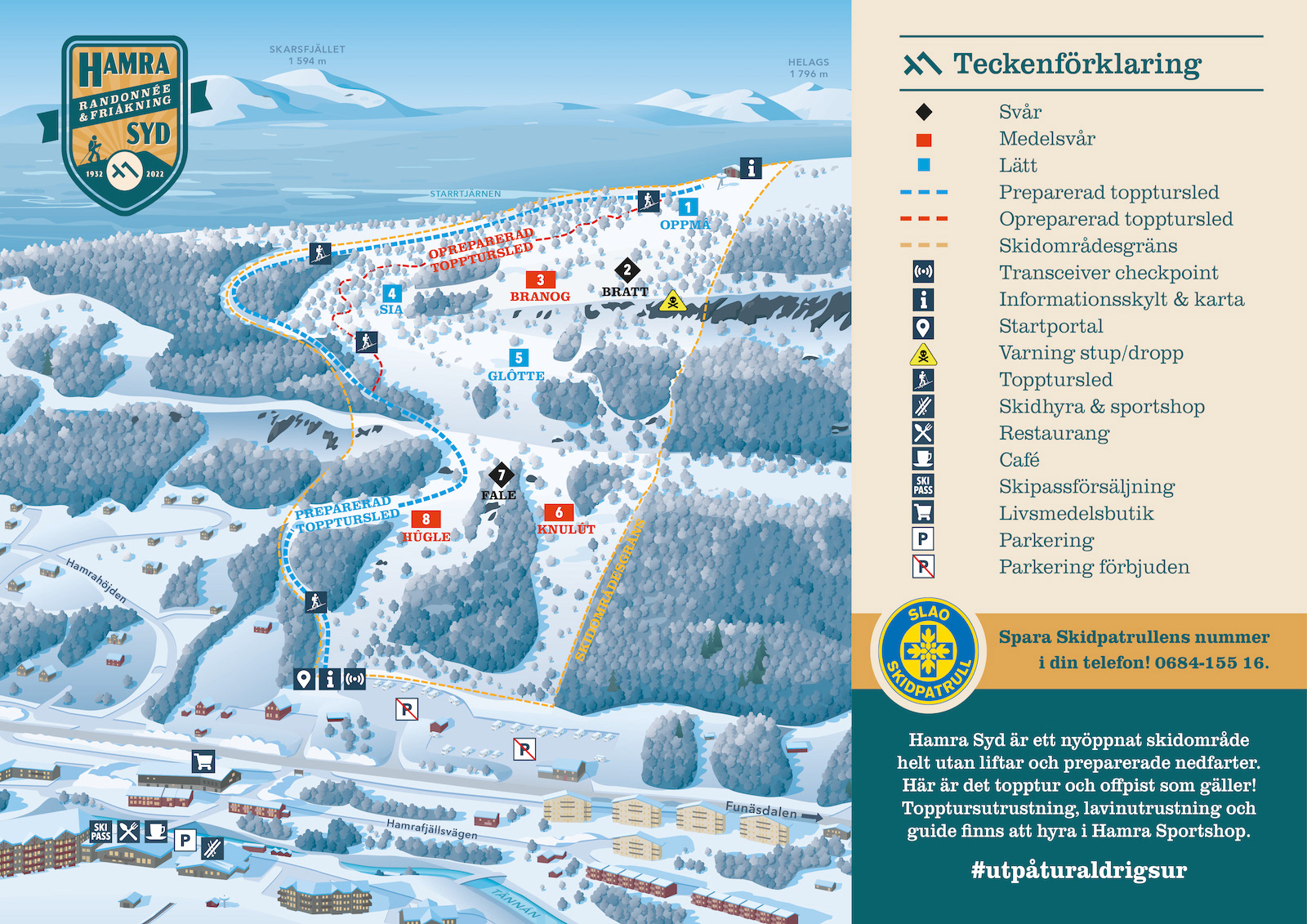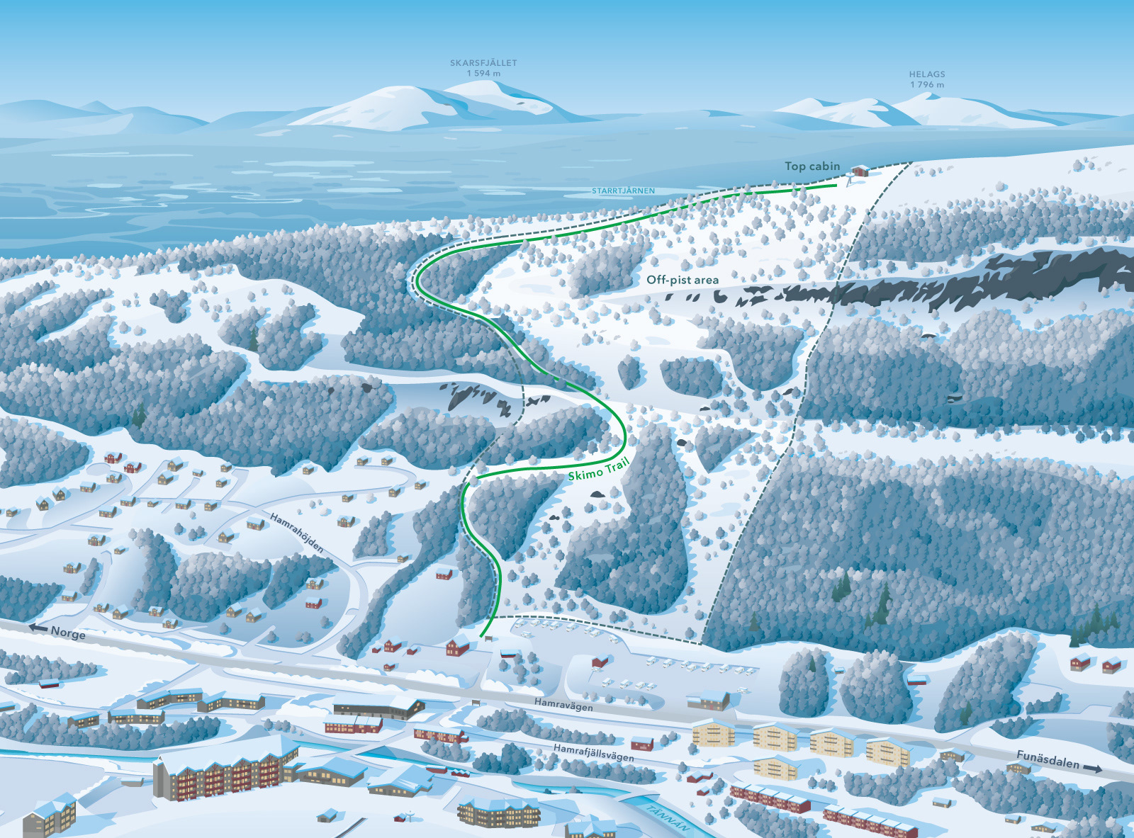 Pistkarta till ett nytt skidområde för friåkning i Tänndalen just där den första skidbacken en gång låg.